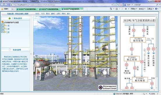 系統集成三維模型子系統,根據企業名稱或者關鍵設備智能關聯到三維模型頁面。如下圖所示,左側菜單顯示當前企業所有的三維模型標準件,右側顯示裝置生產流程示意圖,點擊菜單或者流程圖節點皆可直接切換到相關視點。