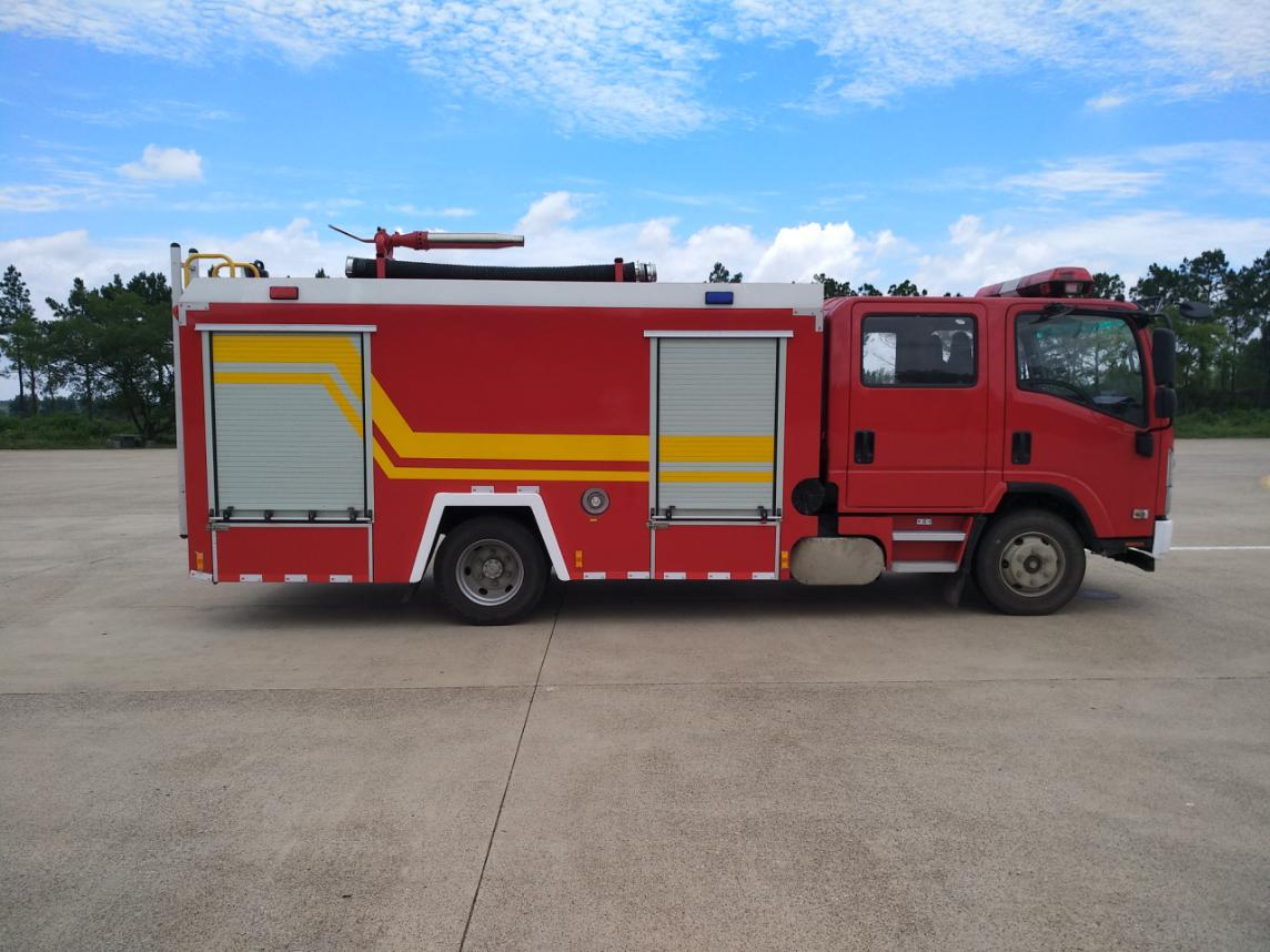 CLW5100GXFSG35/QL型水罐消防車,采用重慶五十鈴700P,型號QL1110ANKAY二類底盤改裝而成。整車由消防員乘員室和車身兩大部分組成,乘員室為雙排駕駛室,可乘坐 3+3 人,該車為外露罐結構,車身前部為器材箱,中部為水罐,后部為泵房。載液罐體為優質碳鋼,內部噴涂環氧底漆及環氧瀝青漆,與底盤采用彈性連接,載水量3550kg,裝備了CB20.10/15.30中低壓消防泵,額定流量15/30 L/S,車頂安裝PS30-50D型消防炮。該車最大的特點是載液量大、操控性好、維修簡便。可廣泛應用于公安消防隊、廠礦企業及社區、碼頭等場所,撲救大型油類火災和一般物質火災。