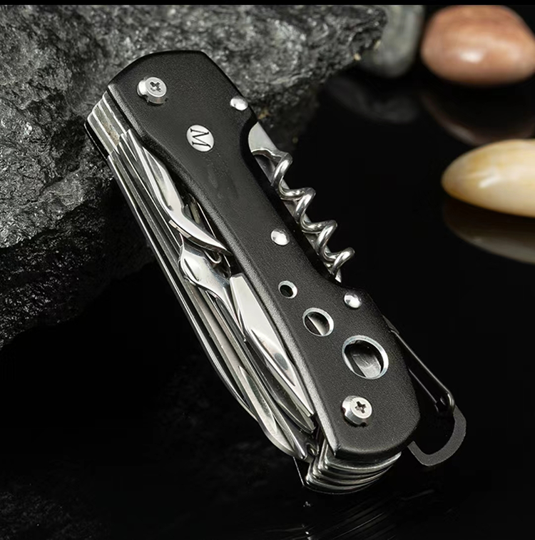 多功能刀又常稱為多功能戶外刀或萬用刀,是含有許多工具在一個刀身上的折疊小刀。多功能刀的組合工具不僅表現在品種上,同時還在于巧妙的組合在同一種工具上,使有限的工具發揮更多的實功能。一把普通的多功能刀,一般都有主刀、小刀、剪刀、開瓶器、木鋸、小改錐、拔木塞鉆、牙簽、小鑷子等工具。而在一些工具上還設計了多種功用。