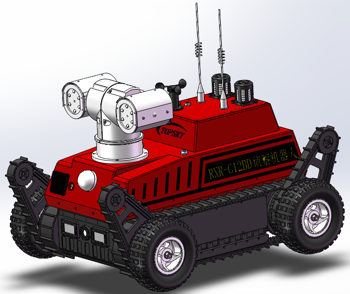 采用前后4擺臂+履帶+輪胎的結構形式,輪胎可以最大有效提高前進速度、履帶和擺臂適合復雜地形,可以提高越障性能;