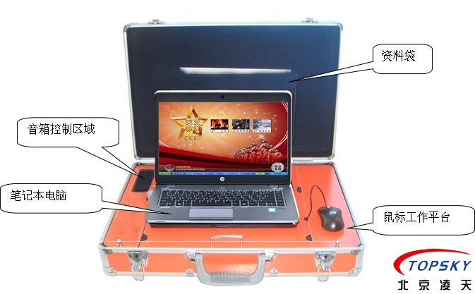 開式手提箱結構,箱體上蓋部分為資料存放處,下箱體部分的上層為筆記本電腦操作平臺,右側為鼠標工作平臺,左側為音箱控制區域,下箱體的下層部分為一起設備存放區域;