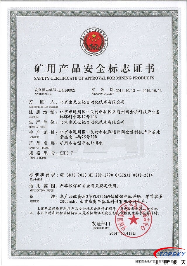 10)提供煤安認(rèn)證原件、防爆認(rèn)證原件