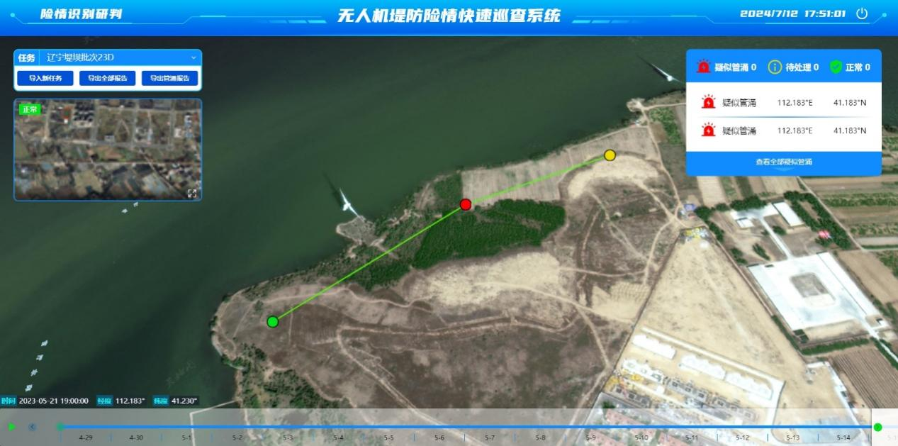 系統主要針對汛期堤防滲漏、管涌、塌陷場景進行快速排查隱患需求,以無人機搭載雙光相機匹配原理,結合人工智能辨識算法形式進行巡查;系統設計化繁為簡,具備GIS高清底圖,能夠展示村莊、河道名稱及經緯度信息,數據支持一鍵處理,保障高效運行。