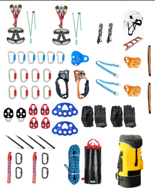 用于輔助救援人員進行攀爬以及搭建救援通道搶救和運送傷員。包含繩索手套、山岳救援頭盔、頭燈、護目鏡、全身式安全吊帶、安全繩、安全鉤、上升器、抓繩器、下降器、滑輪、連接帶、 緩沖器等。