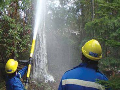 雙握把泡沫槍 可簡單、快速噴射泡沫控制現場火勢,打開混合腔的進水,塞入泡 沫棒,擰緊密封蓋,連接進 水管,就可以噴射泡沫,有 效的控制火勢。