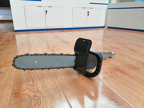PJQL-4 礦用氣動鋸(以下簡稱氣動鋸),是我公司經過多年的探索,在機電、通風、采煤等各科室的高技術素質科技人員的通力合作下,為煤礦開發出的礦用切割與開槽工具。氣動鋸由鋸頭、鏈條、聚氨酯軟管三大部分組成,聚氨酯軟管將氣源和氣動鋸連接起來,氣源提供的氣壓驅動氣動鋸高速運轉,進行切割。工作時,冷卻水通過導板中間的孔流向切割部位,起到冷卻和降塵的作用。并且具備雙重斷水保護功能,氣動鋸在切割時采取了濕法切割水冷卻,以避免切割時出現火花。可用于采掘工作面使用的煤層、巖石切割,用于密閉墻的砌筑,也可用于礦山救援時的混凝土與巖石破拆。
