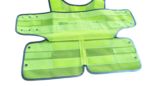 溫控警用背心(低溫型)為前開襟馬甲式樣,開襟用拉鏈拉開,前后身分別具有兩道橫向反光帶;前身胸部左右分別綴釘胸微、警號錦絲搭扣帶絨面、對講機袢、前后身兩側用錦絲搭扣及銅制四合扣連接,針對不同腰圍三檔調節肥瘦;可根據不同身高調節長短