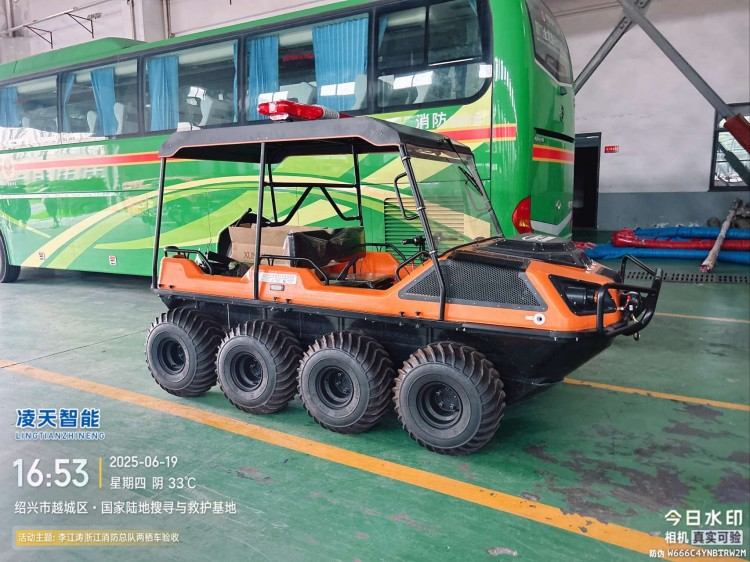 在復(fù)雜惡劣的地形條件和自然環(huán)境下,水陸兩棲全地形車可以讓搜救隊員和攜帶的救援裝備快速到達救援現(xiàn)場,減少徒步帶來提供消耗,完成最后一公里最好五分鐘緊急救援任務(wù)。水陸兩棲全地形車可配備點到絞盤、救援擔(dān)架組件、探照燈、警示燈、警報器、脫鉤、破拆工具等裝備, 給救援團隊提供救援保障,更安全的解救傷員和疏散群眾。