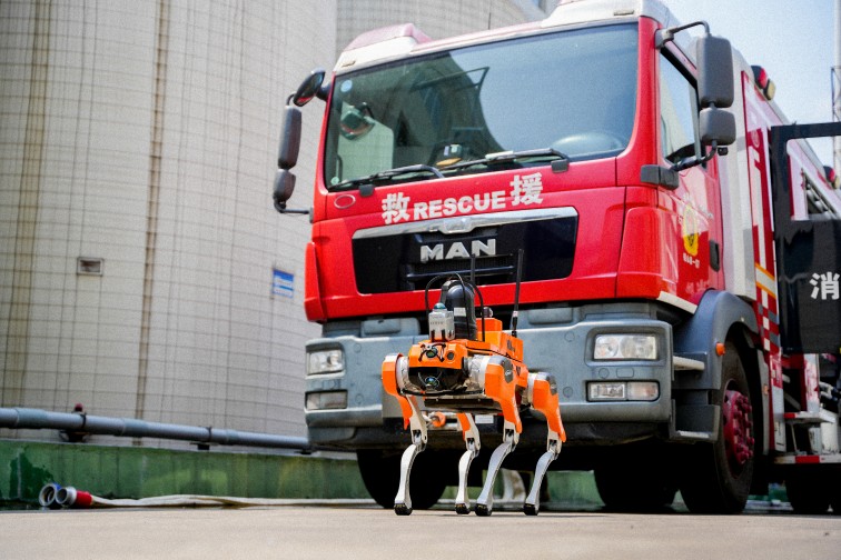 RXZ-C7Q 救援偵檢四足機器人搭載3D建模雷達,4D激光雷達,360°×90°半球超廣角感知能力,超低盲點,可以做出跳躍、伸展、握手、高興、跳人、坐下等手勢; 內置長續航電池,滿足消防偵察救援需求。