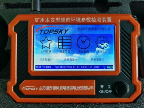 災(zāi)區(qū)環(huán)境監(jiān)測(cè)儀由礦用環(huán)境參數(shù)檢測(cè)探頭(以下簡(jiǎn)稱探頭)和礦用本安型超前環(huán)境參數(shù)檢測(cè)裝置主機(jī)(以下簡(jiǎn)稱主機(jī))組成,主機(jī)與探頭通過無線進(jìn)行通信。探頭具有實(shí)時(shí)連續(xù)檢測(cè)CH4、O2、CO、CO2、H2S、溫度共6種參數(shù),并可超限報(bào)警。主機(jī)具有觸摸屏顯示,可實(shí)時(shí)顯示和存儲(chǔ)探頭檢測(cè)的環(huán)境參數(shù)數(shù)據(jù),同時(shí)主機(jī)可以實(shí)現(xiàn)歷時(shí)數(shù)據(jù)曲線便于工作人員對(duì)環(huán)境參數(shù)的特性進(jìn)行分析,同時(shí)主機(jī)具有藍(lán)牙功能,在井上可實(shí)現(xiàn)一鍵快速打印歷時(shí)數(shù)據(jù)。